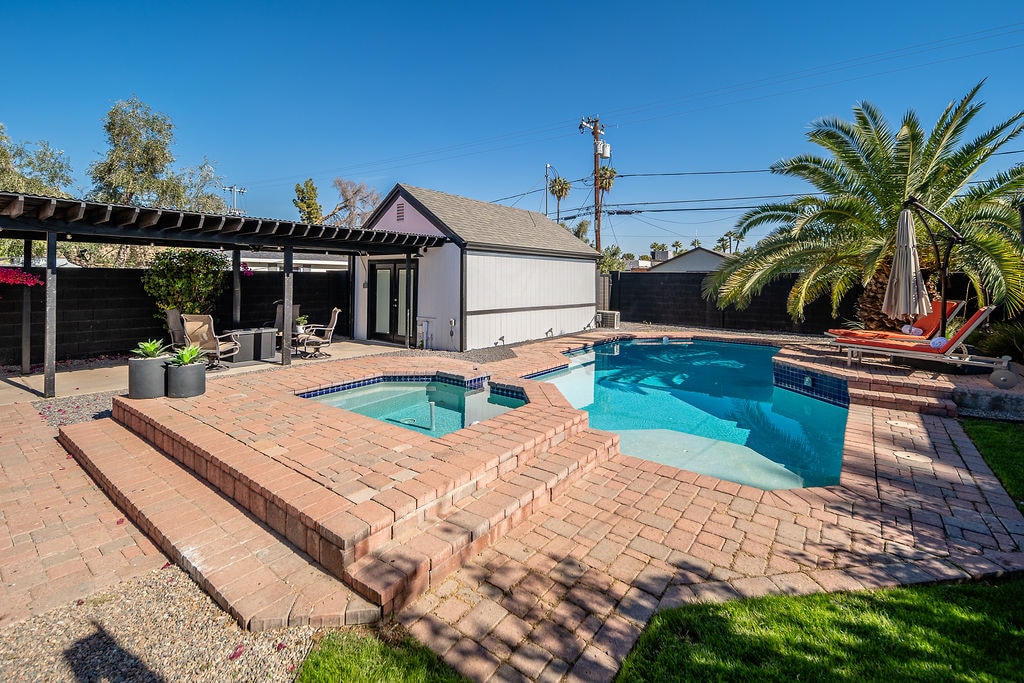🏊 Year-round relaxation in heated saltwater pool & spa (gentle on skin/eyes) 🔥 Cozy up to fire features 🍳 Fully stocked kitchen + outdoor propane BBQ grill 🎱 Game room with pool table, foosball, darts, & big-screen TV 🌞 Outdoor dining area & bar for enjoying AZ weather 📺 Outdoor TV for games/movies while soaking in the spa 🚗 Easy access to 2 major freeways 🎨 Artfully & uniquely decorated Resort-like escape in Phoenix (Glendale mailing) – perfect for family, golf trips & holidays
