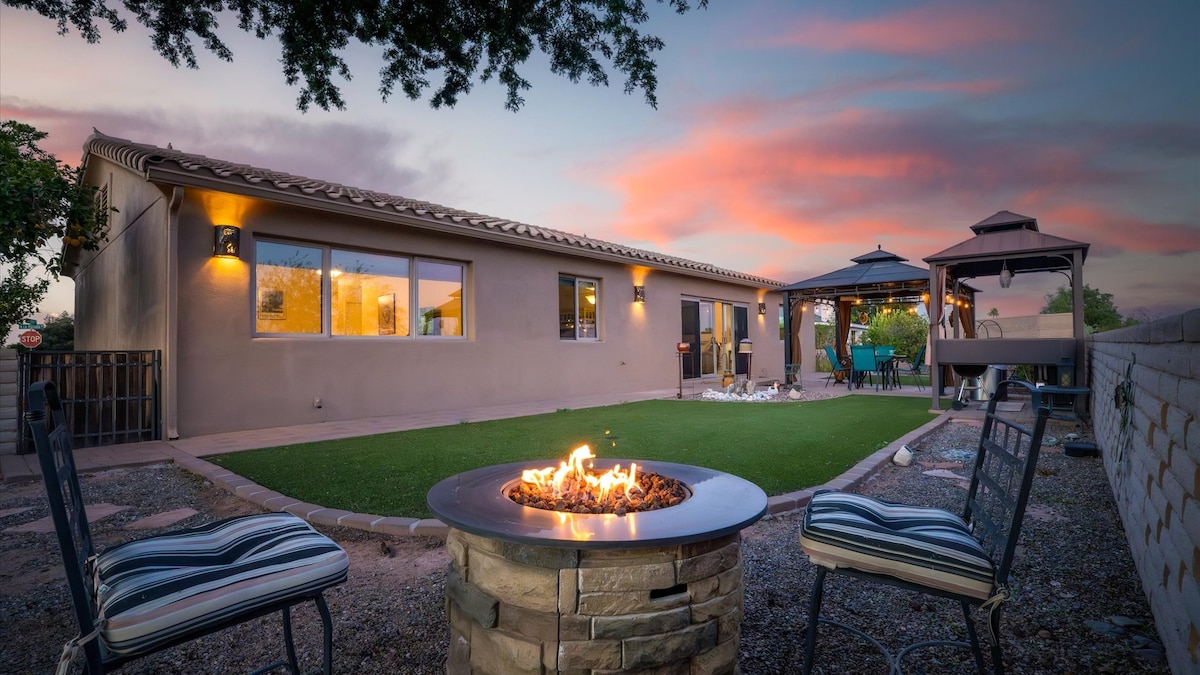 Welcome to Desert Diamond Escape! Your own slice of paradise in San Tan Valley, AZ! Our impeccably furnished 1500 square foot retreat, boasting three cozy bedrooms and two luxurious bathrooms. Dive into relaxation in our 12,000 gallon salt water pool complete with a soothing waterfall. Unwind in our outdoor oasis featuring a charming gazebo, BBQ, lounge sets, putting green. Fully stocked kitchen, 4 TVs, fiber internet. Don't miss this exceptional experience! - Pool heat is an additional fee.