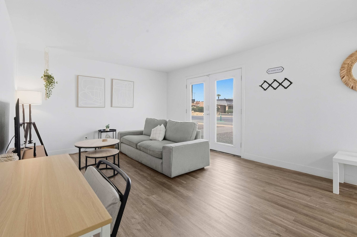 Welcome to our 1 bed 1 bath apartment, in the heart of downtown Phoenix! Our apartment is perfect for solo travelers or couples looking to explore the vibrant city. Enjoy our stylish living room, fully equipped kitchen and comfortable bedroom. You'll be in a vibrant and busy neighborhood, next to all the best restaurants, bars, and attractions that Phoenix has to offer. Next to Roosevelt Row ✔ Fully Equipped Kitchen ✔ Comfortable Bedroom w/ Queen Bed ✔ Office Desk ✔ Wi-Fi ✔ Free Garage Parking