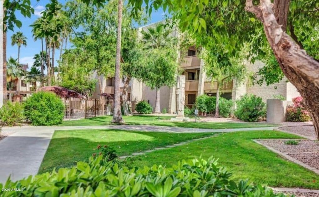 This one bedroom one bathroom second floor condo (half a flight of stairs) is under ONE MILE to it all: Fashion Square, Old Town Scottsdale, and more! You can take a leisurely stroll and reach Old Town in under 20 minutes. It is also under 12 minutes to Tempe Marketplace. Maya Condo complex also has a large pool, hot tub, and small (older) gym. The patio is set up in a relaxing bohemian vide - the perfect place to decompress after a long day of exploring!