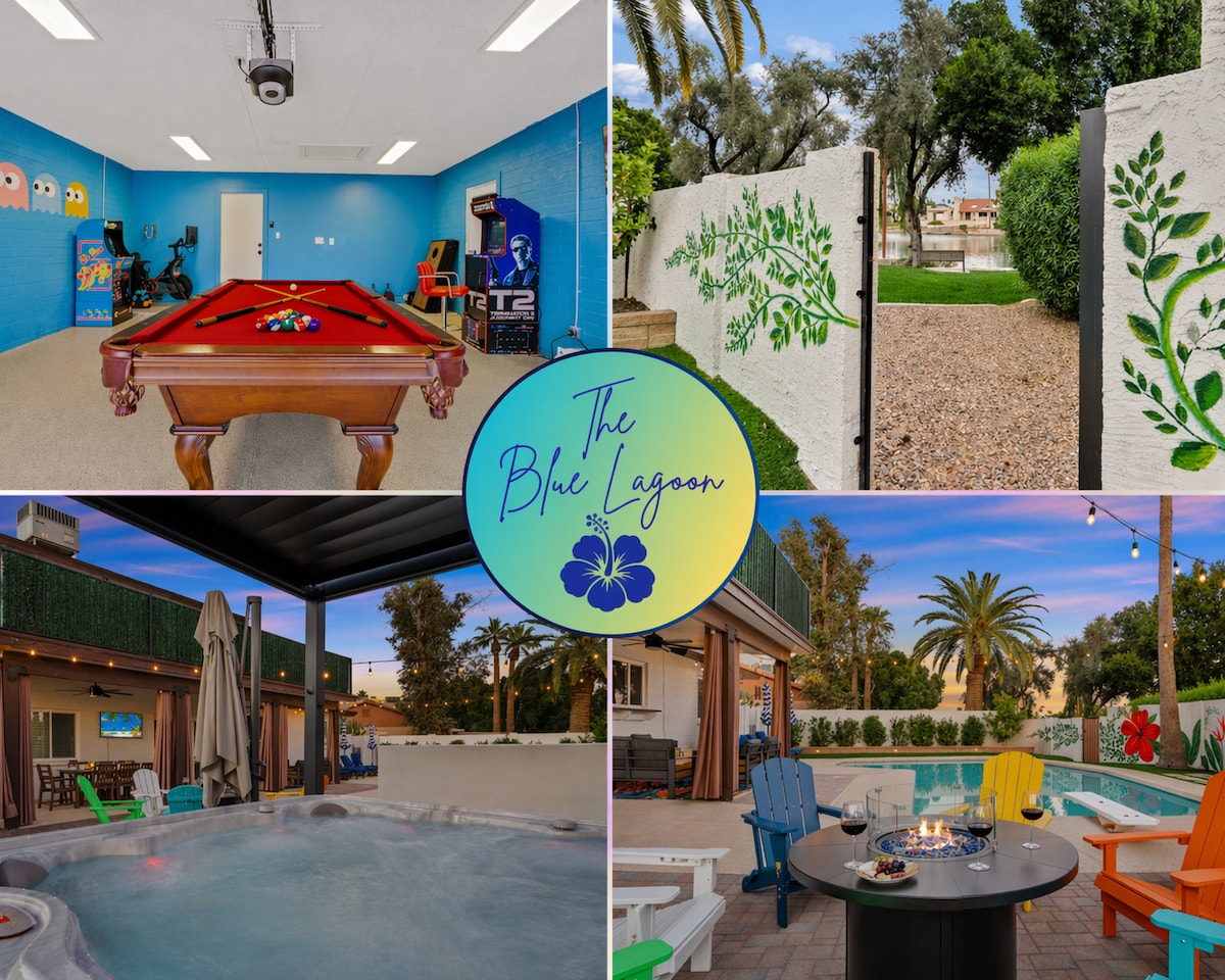 Forget your worries in this STUNNING LAKEFRONT with SALTWATER (softer skin) HEATED Pool & SPA & therapy JETS! Take a paddle boat, or kayak ride or go fishing right off the deck in a freshwater lake. Relax in a massage chair. 2 Arcade. EV charger. Foosball, ping pong. 2 kings, 1 Cal king, 2 queen bunk bed, 2 twins. Located by famous Ocotillo golf course! NO CARPET to avoid collection of dust,allergens. FOR INSURANCE AND CITY COMPLIANCE, ONLY REGISTERED GUESTS ARE ALLOWED ON THE PROPERTY