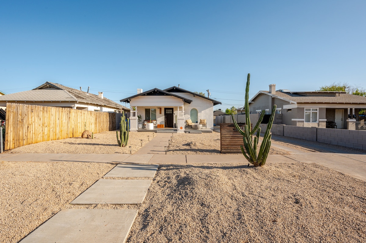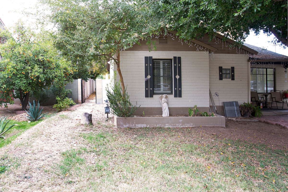 Historic guesthouse in the heart of the Melrose District! EV charger! Walking distance to restaurants, bars, coffee shops, the famous Melrose Vintage shops, grocery stores, LA Fitness and more! Want to head downtown to Chase Field, Talking Stick Arena for a game or a show? Campbell Street Light Rail station is only five short blocks away! No need for a car, you can take the Light Rail from Sky Harbor International Airport, save your money for entertainment! Off street parking if you have a car!