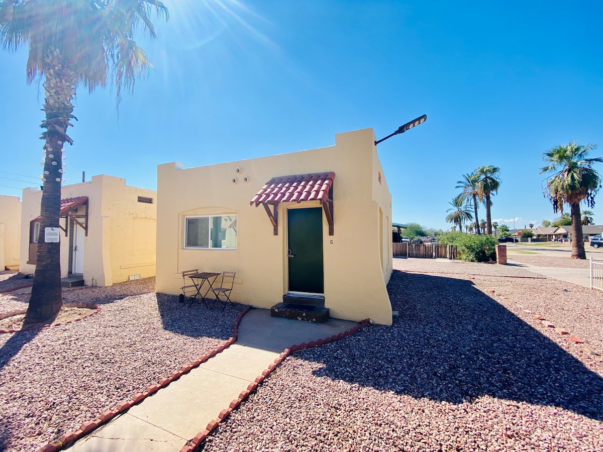 Welcome to your private casita (tiny home) in the heart of Midtown. Located right across the street from Starbucks, Buffalo Exchange, and the famous Taco Guild, relax comfortably with vaulted ceilings, a spacious layout, outdoor patio, and a quiet bedroom with a Queen-size bed — perfect for solo travelers or couples. Plus, the Light Rail station is walkable, which goes to Uptown, Downtown, the airport, Tempe, and Mesa. You are only: 7 mins to Downtown 9 mins to the Airport 15 mins to Scottsdale