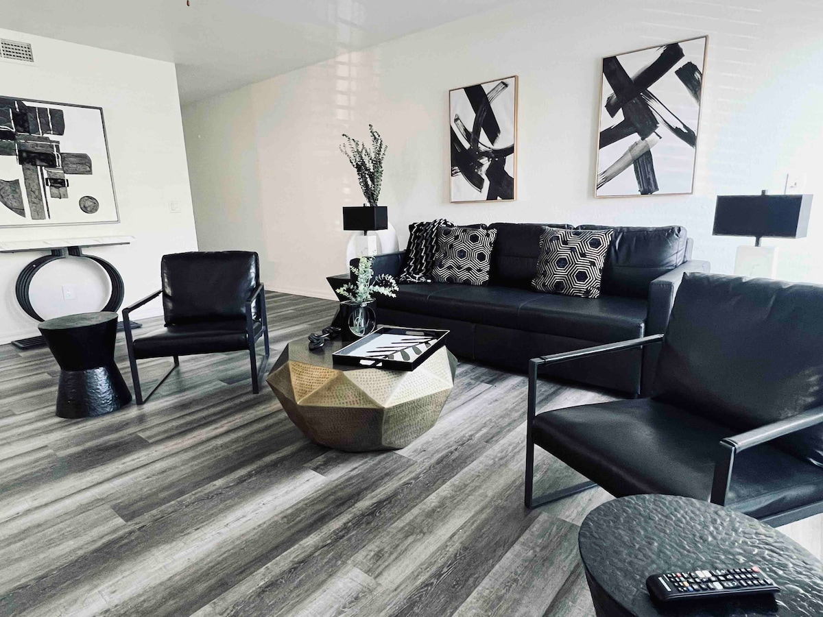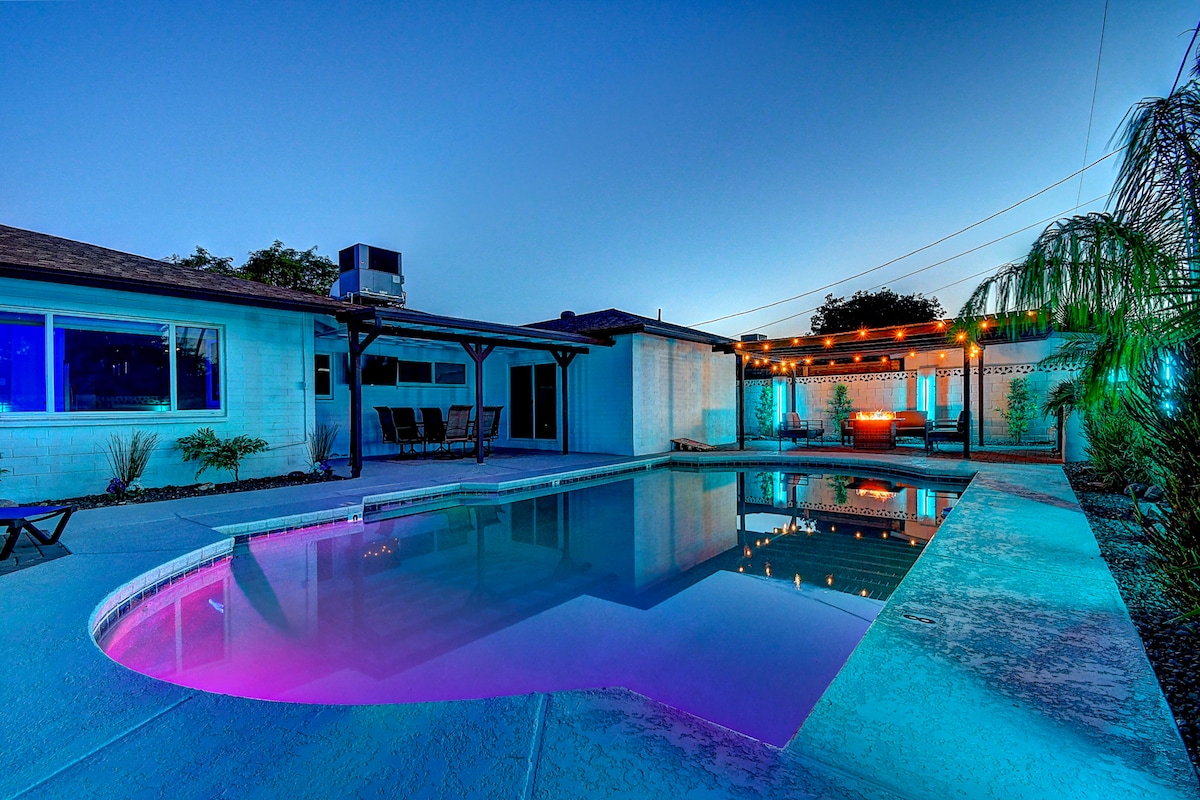 Discover your stylish oasis in South Scottsdale, moments from Old Town. This 4-bedroom w/ 7 beds retreat features all new furniture, TVs in every room, pool table, arcade game, and memory foam mattresses. The fully remodeled house offers a dazzling sunset mural as you walk out to the spacious backyard for games, BBQ, hammock, outdoor dining table, plenty of seating and a beautiful diving pool with electric heater (inquire for more info). Have the ultimate time at this relaxing retreat!