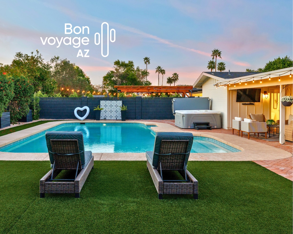 Welcome to The Hidden Hacienda Scottsdale! A fun, whimsical retreat with cowboy-chic decor, pool, spa, karaoke, and games—perfect for bachelorettes, families, or golf getaways. Sleeps 10 with comfy beds, smart TVs, a pool table and a fully stocked kitchen. Lounge beneath swaying palm trees, practice your swing on the mini putting green, or unwind in your private backyard oasis with cozy seating fire-pit and outdoor tv. Minutes to Kierland Commons, top golf courses, Spring Training and more!
