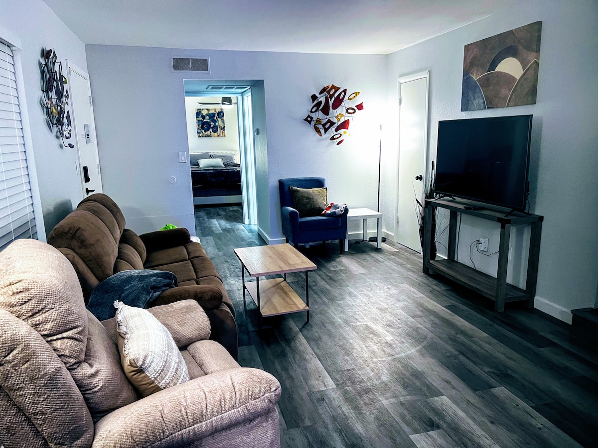 Luxuriously fully furnished 1 Bedroom 1200 Sq. Ft. apt. ground floor located in the Heart of Tempe/ASU and just minutes from Tempe Town Lake, Gammage, Old Town Scottsdale, Papago Park, and St. Luke's hospital. King Size Bed. 55" Roku TV's for the living room and master bedroom. High-speed WiFi. Self Check-In provides easy access using a unique 4 digit code which is sent the day of arrival. 2 Free Parking Spaces in driveway. 8 steps from the car to the front door. Well lit entry.