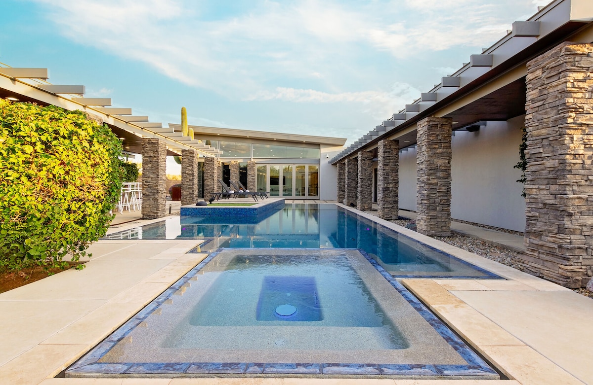WHISPERING WIND - NEW LUXURY LISTING - This modern desert estate in North Scottsdale offers resort-style living on a private 1-acre lot. Enjoy a heated pool, spa, outdoor cabana, gourmet kitchen with premium appliances, and soaring 21-ft ceilings with floor-to-ceiling windows. With multiple primary suites and designer finishes throughout, this luxury retreat is perfect for groups, families, and corporate stays—just minutes from Troon Golf, hiking, and upscale dining.