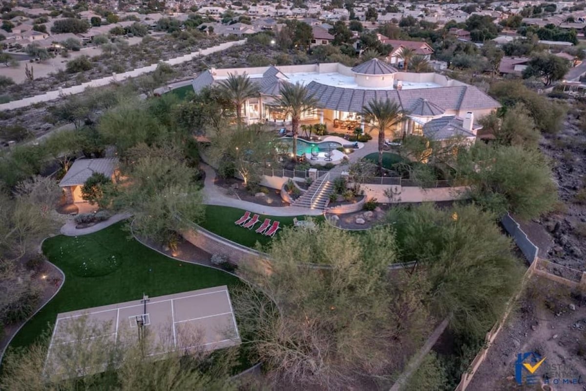 Unveiling Surrey Palms, a lavish vacation retreat! With 5 bedrooms, 5.5 bathrooms, and an optional 6th bedroom in the casita, this exquisite property sits on a beautifully landscaped and private half-acre lot. Enjoy the heated pool ($100/day extra), two fire pits, Sonos system gracing both indoor and outdoor spaces, a refreshing misting system, media room, a well-equipped gym, a detached game casita, and a sports court. Prepare for an unforgettable stay filled with indulgence and relaxation!
