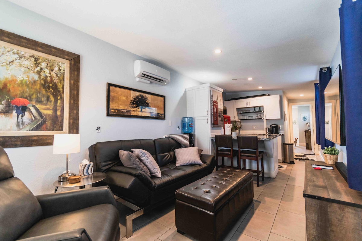 Welcome to the tropical soirée! Escape to a piece of paradise equipped with everything you need for your stay. We offer a fully stocked kitchenette, a private outdoor bistro table and a shared courtyard with a large fire pit. Hop on one of our two beach cruisers and ride down to the movie theaters, brunch and dinner spots only 5 min away! This will truly be your favorite spot to either relax, explore or to stay while traveling for business. We look forward to hosting you!
