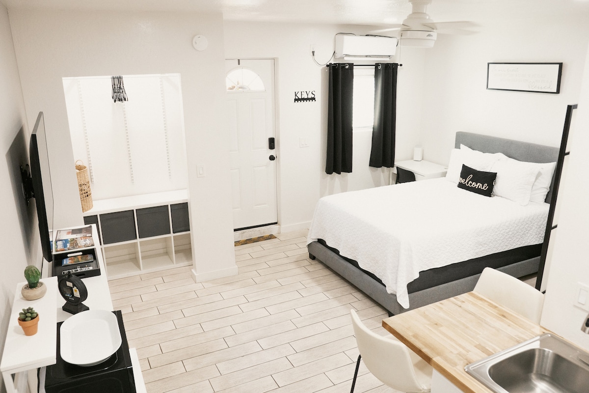 Private cozy studio in Chandler with a prime location! Features a queen bed, full bathroom, compact kitchen, workspace, washer/dryer, fast Wi-Fi, Netflix & Keurig. Enjoy your private patio with evening lights or walk to the park across the street. Free parking and bikes included. Minutes to casinos, shopping, and dining, with easy access to Phoenix, Tucson, Sedona, Flagstaff, and the Grand Canyon. Perfect for work, relaxation, or a weekend getaway!