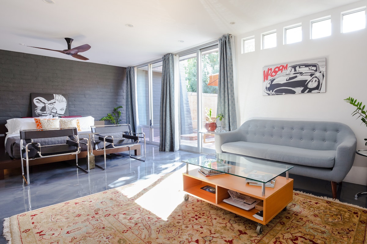 Formerly a beauty parlor back in the 1950's, 308M - is a independent 1 bdrm unit with a secret patio & PRIVATE SPA @ a award winning redevelopment complex. A vintage modern urban island in the heart of Phoenix. Walk to everything Down town: cafes, convention center, restaurants, museums & night life. Located @ HANCE Park/Roosevelt Row Arts District & First Friday! INSTANT access to expressways to get you anywhere in the valley. ( 1 mile to FOOTPRINT/CHASE stadium. 4 mile to SKY HARBOR)
