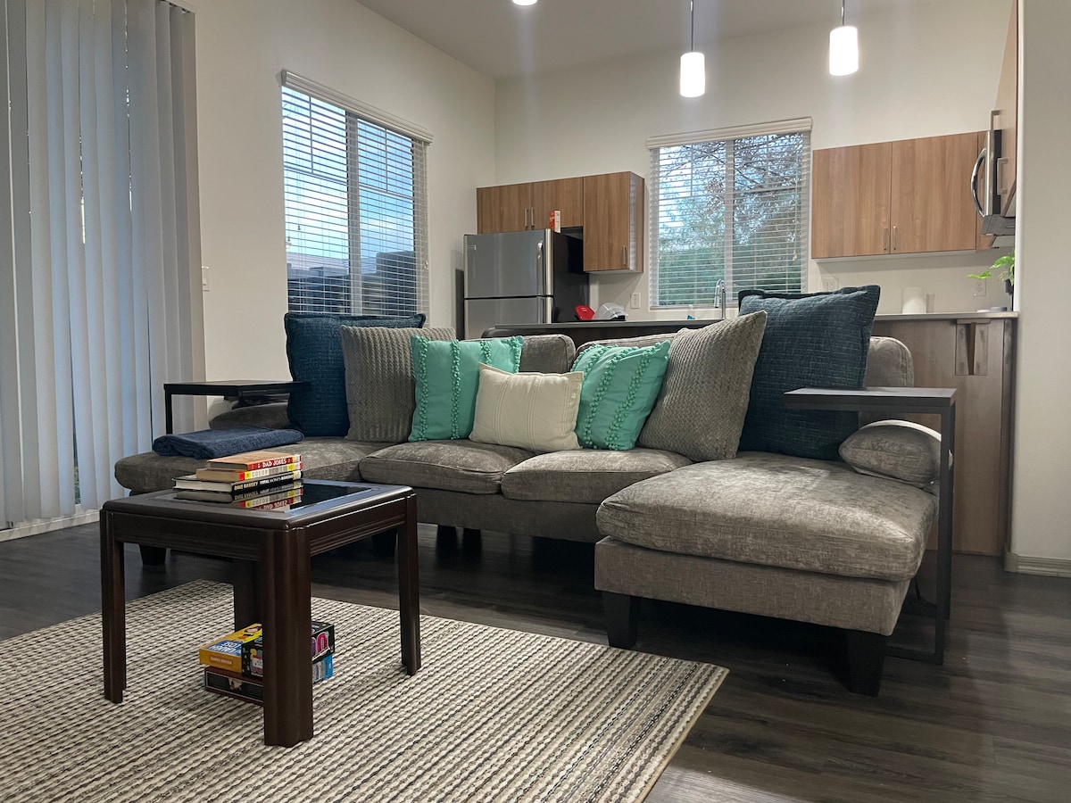 This townhome is located in Tempe. Unit is open and sunny. Dog friendly, close to spring training, Cubs, A's, Giants, Angels & more. Minutes from downtown Tempe, ASU, large outlet mall with movies & restaurants, common pools (3) and hot tubs, one heated pool in winter, walk to Kiwanis park. Brand new (2025) awesome dog park that is walking distance at Kiwanis Park. Kitchen is well supplied for cooking.