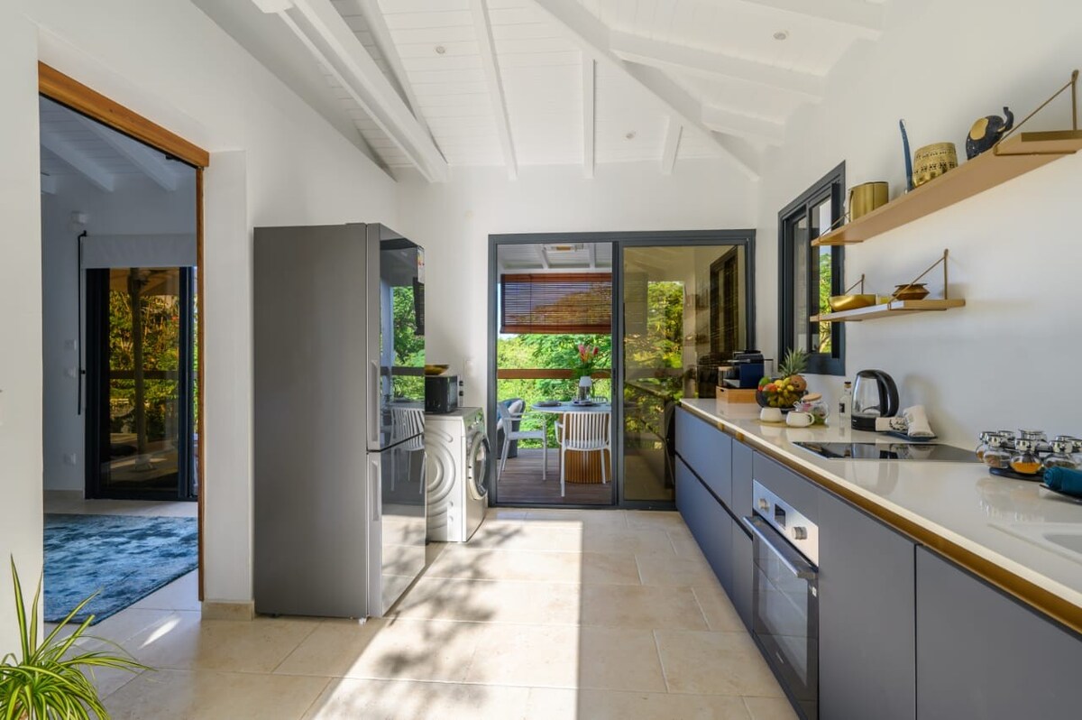 "Le Colibris Amoureux" vous propose son loft de luxe indépendant, offrant une vue spectaculaire sur le lagon. Ce lieu est parfait pour ceux cherchant à se relaxer tout en contemplant la mer, la Dominique, les Saintes, ainsi que le littoral de Marie-Galante. Le loft se compose d'un grand espace de vie qui inclut un salon et une cuisine toute équipée, une piscine balnéo privée, ainsi qu'une vaste chambre climatisée dotée d'une salle de bain en suite et de toilettes séparées.