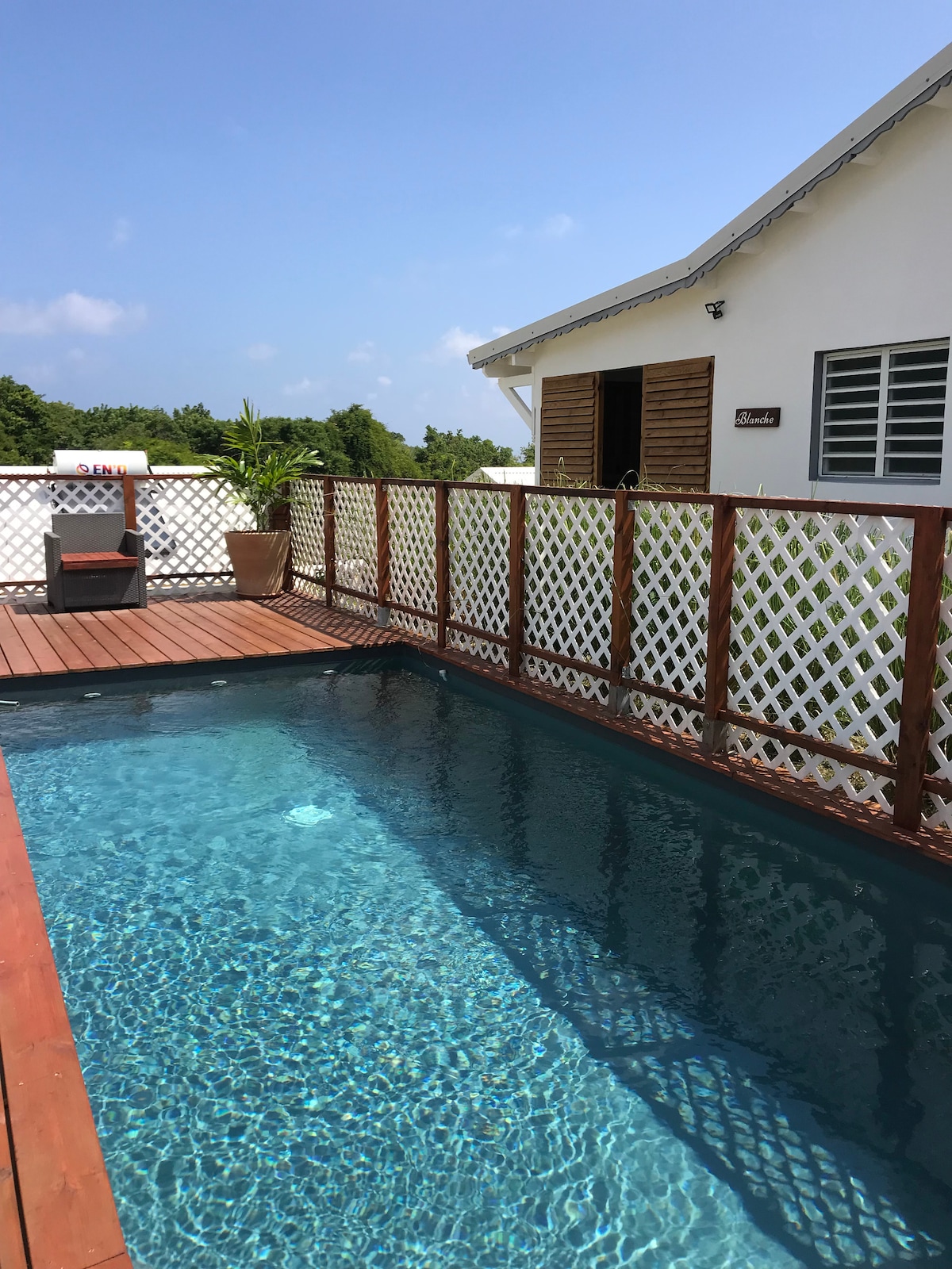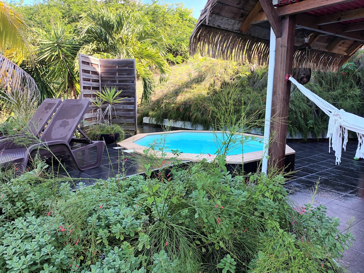 Ce meublé de 60 m², dispose d'une vue sur la Guadeloupe et les iles des Saintes . Intérieur bois, aménagement très fonctionnel: · Chambre climatisée munie d'un lit 2 places 160 · Séjour muni d'un canapé lit et d’un téléviseur écran plat. Le · terrasse de 26 m² avec hamac, petit salon de jardin donnant accès direct à une piscine privée avec bain de soleil. · Cuisine équipée de four à micro ondes, plaque de cuisson 4 feux, four, cafetière et grille pain . · Douche et WC.