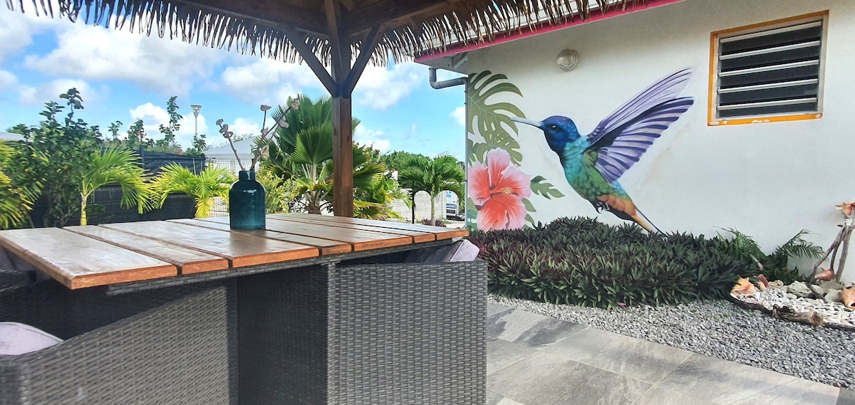 🐝 Bienvenue à la Ruche de Maïa, Situé dans le village Kawann, calme et sécurisé, la Ruche de Maïa bénéficie d'une proximité à la plage accessible à pied en poussant le portail du site. Moderne et décoré avec goût, ce beau cocon est idéal pour des vacances en couple ou entre amis et offre le confort et les équipements indispensables pour un séjour réussi ! Il dispose d’une terrasse bien exposée avec vue sur jardin tropical et permet de rejoindre la piscine du complexe en moins d'une minute.