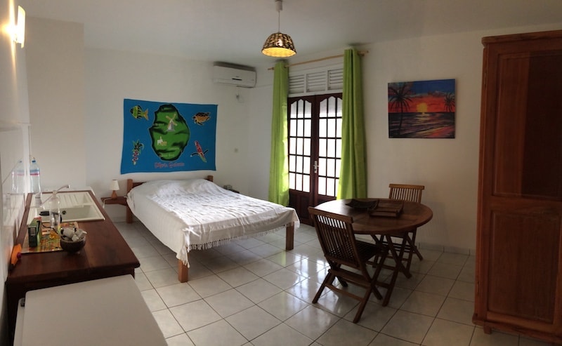 La Cabane dans l'arbre du jardin est un logement atypique de type studio pour 2 personnes. Elle fait partie de : Les gîtes tit'anse et Spa Elle est composée : •Lit suspendu de 160. •Une piscine commune aux gîtes •Coin cuisine •Douche (eau chaude) •1 Wc Une machine à laver est disponible,local commun Sabéha et Frédo vous réservent un accueil chaleureux dans leurs gîtes à flanc du morne, à 5 minutes à pied de la plage de petite anse avec un accès à la piscine commune aux locations de vacances.