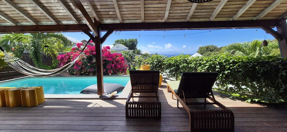 Villa paisible et très spacieuse idéalement située sur les hauteurs de Grand-Bourg. Grande piscine et jolie vue mer à 180°. Entourée de végétations luxuriantes , calme et ressourçant offrant un séjour détente.