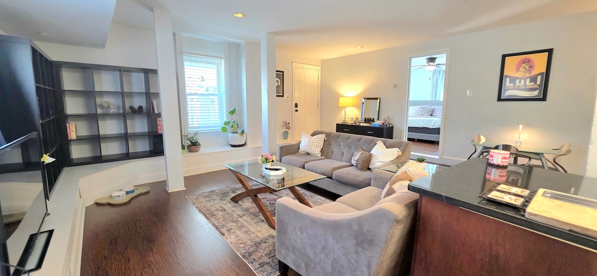 You'll have all you need with this private terrace level suite! Park in the driveway and walk into your private living room complete with big screen flat TV, giant sectional, and kitchen corner with microwave, coffee maker and small refrigerator. You'll continue into the hallway where your quiet bedroom and separate full bath awaits. All you need for rest and relaxation await for you here in my little slice of quiet heaven! All it needs now is you. Welcome!