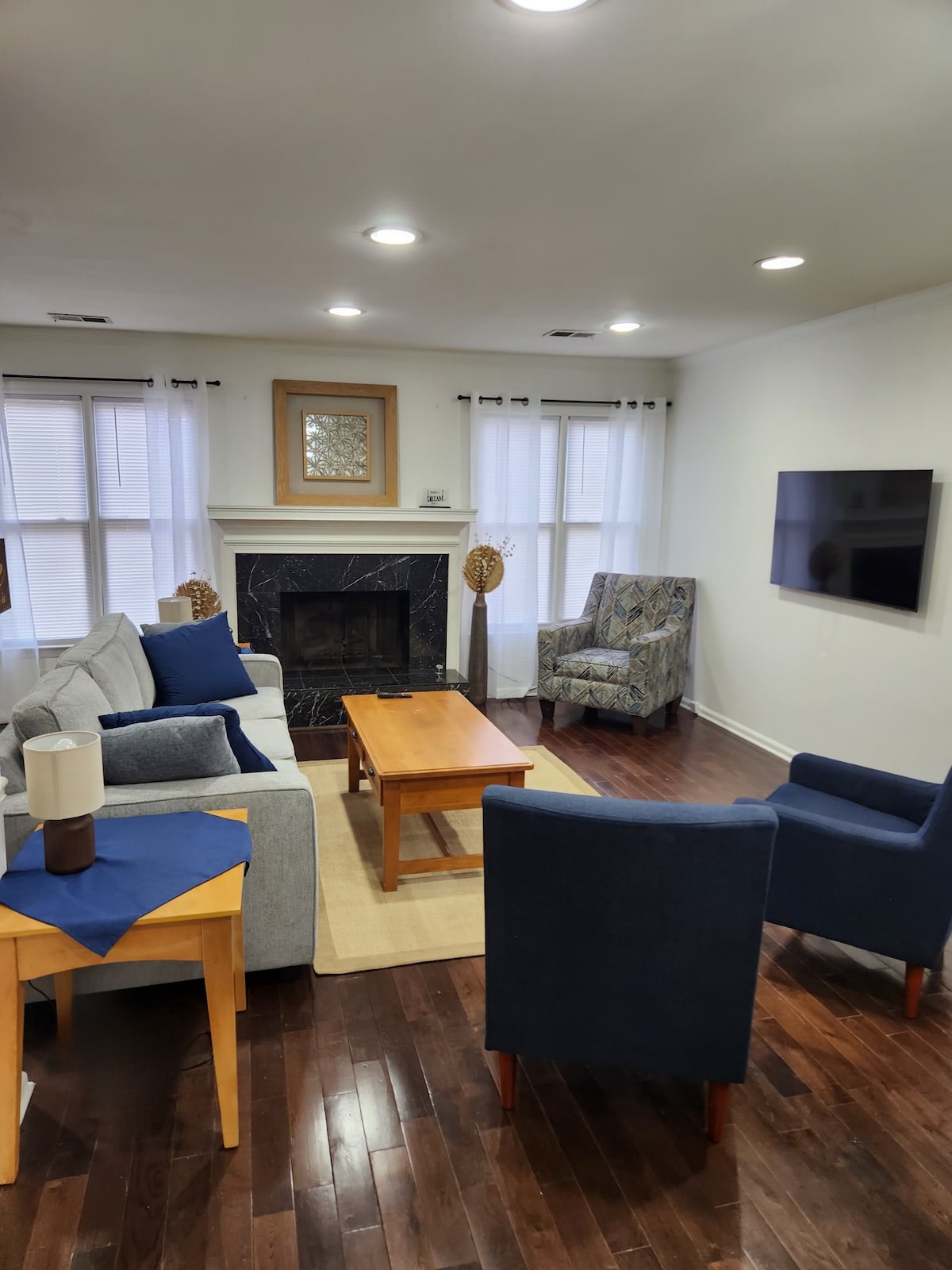 Enjoy your stay at our townhome in Smyrna. This is a 2 bed/2 bath with 4 beds total. 1 king, 2 full, and a Queen pullout sofa. Fully stocked kitchen with everything you need to make a gourmet meal. Rental includes all appliances, 3 smart tv's, washer/dryer, dining room table, sofa with queen sleeper, and luxury vinyl plank flooring throughout. There is a covered back patio and deck with a grill. Located near restaurants, parks, entertainment, and easy access to 285. Go Braves!