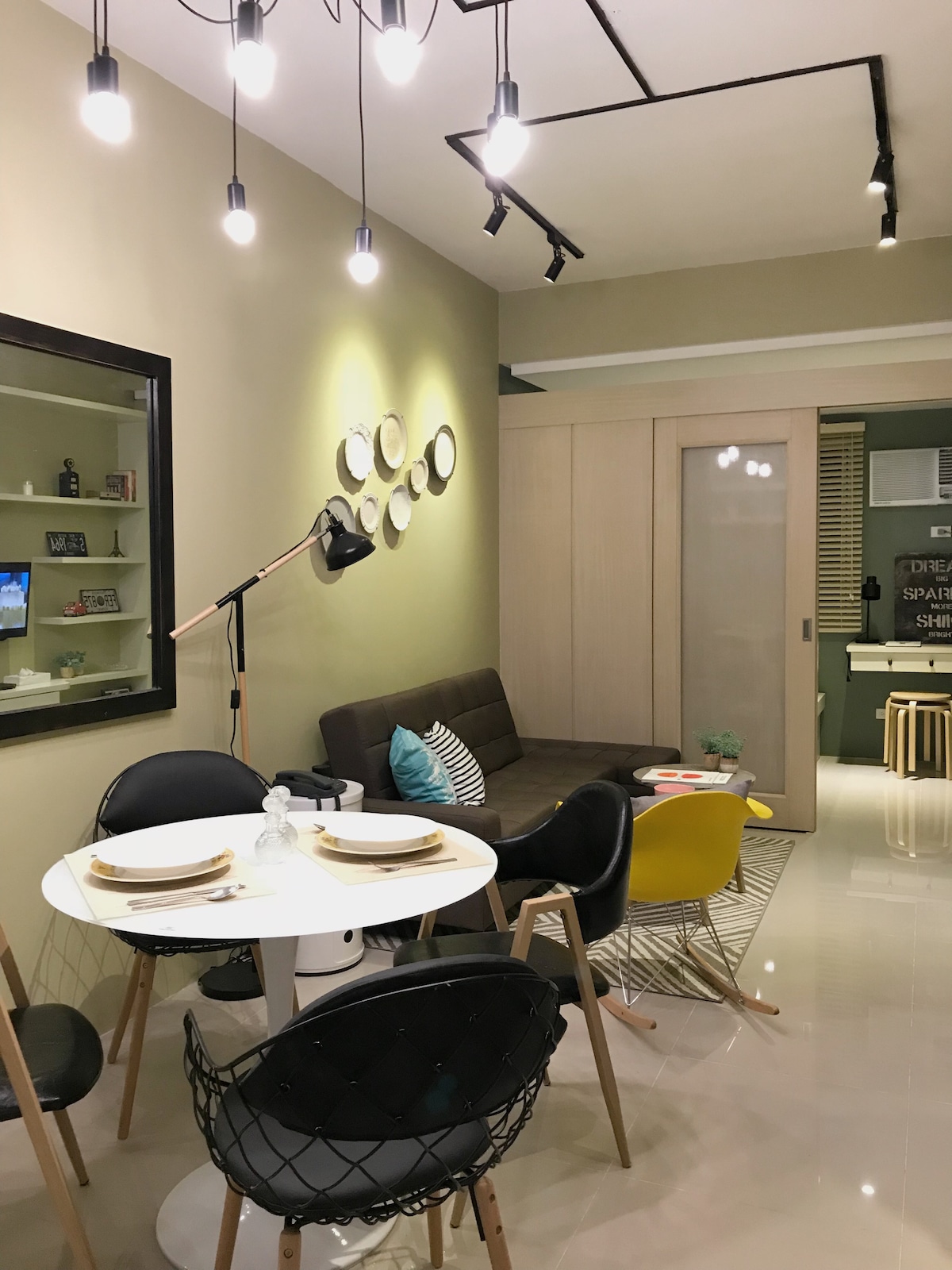 Simple, industrial style, clean and comfy. 29 sqm. unit with 1 bedroom and 1 toilet. FREE Wifi. Best for 2 adults and 2 kids. Living Area has sofa bed and Netflix ready TV. Bedroom has double size bed and Netflix ready TV and office desk and chairs for WFH set up. Kitchen has 4 cu ft fridge, microwave, electric kettle, rice cooker, induction cooker, bread toaster and FREE drinking water. Toilet and Bath has hot and cold shower. We provide towels, basic hygiene kit and hair dryer.