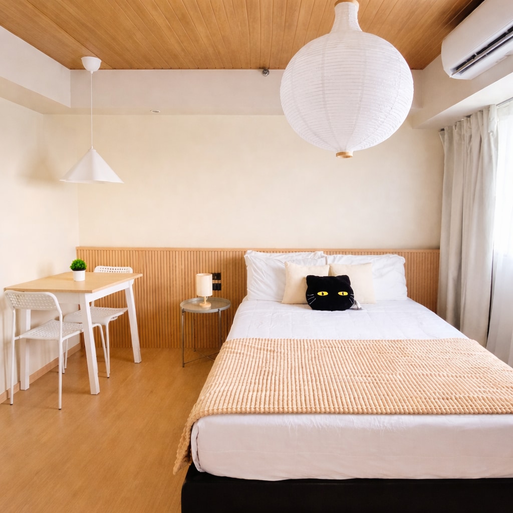 Simple, industrial style, clean and comfy. 29 sqm. unit with 1 bedroom and 1 toilet. FREE Wifi. Best for 2 adults and 2 kids. Living Area has sofa bed and Netflix ready TV. Bedroom has double size bed and Netflix ready TV and office desk and chairs for WFH set up. Kitchen has 4 cu ft fridge, microwave, electric kettle, rice cooker, induction cooker, bread toaster and FREE drinking water. Toilet and Bath has hot and cold shower. We provide towels, basic hygiene kit and hair dryer.