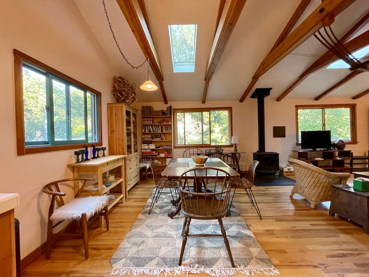 Entering the upstairs you will find a large living/dining/kitchen space constructed of huge beams, wide plank fir floors from wood milled on the property, a bank of windows with a bird's eye view of the forest and a large stained glass window. A fully equipped kitchen and stocked pantry allows you to cook up the bounty of Point Reyes farmers and purveyors on our vintage O’Keefe and Merritt stove. There is a dishwasher, microwave, toaster, mixer, coffee maker and blender. A Balinese dining table of coconut wood and tiger bamboo seats 6. The living area offers a comfortable pullout couch with a memory foam mattress. There is wifi and a smart TV with steaming Netflix, Hulu Plus and Amazon prime. Or enjoy any of the DVDs from our small library. A stereo tuner with an aux cable allows you to stream music from your 2.5mm jack equipped device. A deck off the living room has a table, chairs and a small gas BBQ. Also on the main floor is a sunroom with floor to ceiling glass and a glass roof, Balinese bamboo furniture, breakfast table and a side deck. The bathroom has a claw foot tub and shower. There is central heating with the thermostat located in the living area.