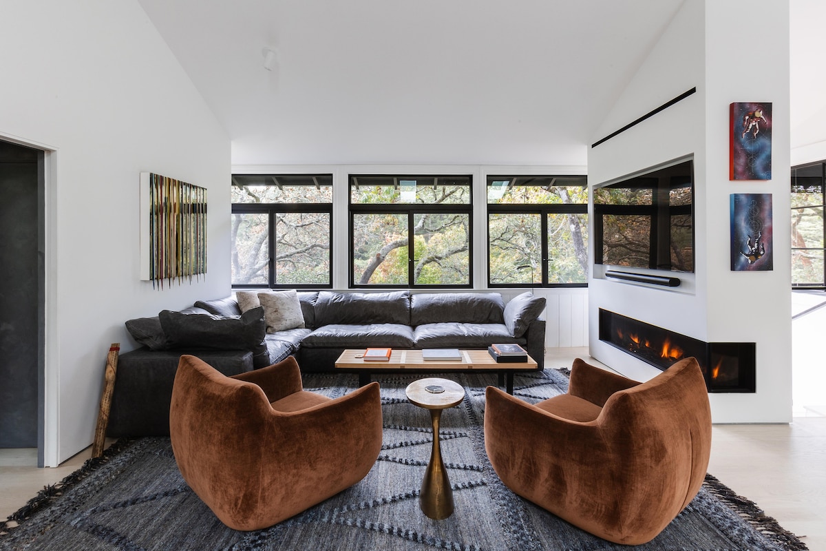 - Sonoma Skyhouse - luxury hilltop retreat with sweeping views of Sonoma Valley - Expansive deck, hot tub, solar-heated pool, sauna & firepit for outdoor living - Contemporary interiors with high-beamed ceilings & large view windows - Principal suite with fireplace, sitting area & spa-style bathroom - Full gym, loft office with balcony, and 4 full bathrooms - Minutes from wineries, Sonoma Plaza & top dining spots