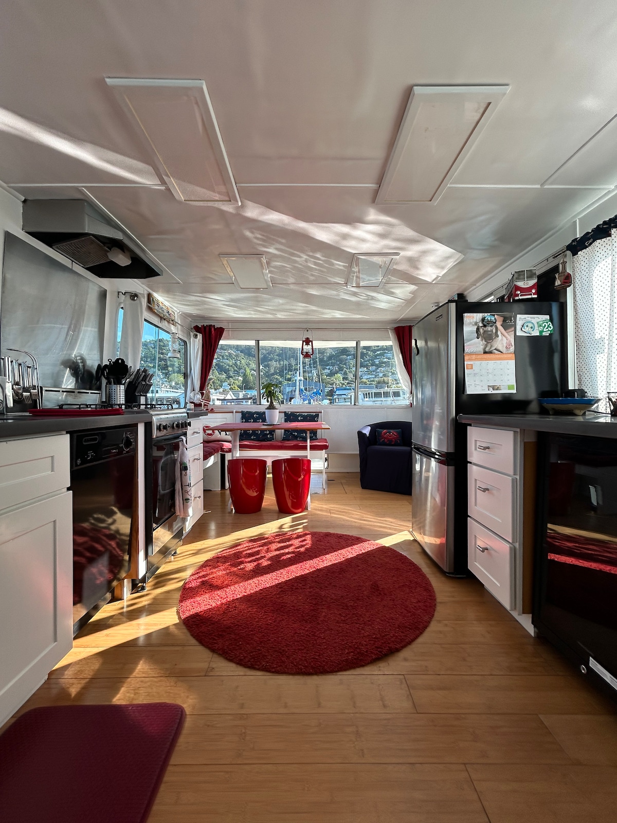 Multilevel 1 bedroom houseboat in desirable Sausalito. Experience tranquility while working from home or while vacationing… Good sized kitchen with full size fridge/freezer, wine fridge, stove & dishwasher. Houseboat in safe marina with quiet neighbors. Restaurants, shops & ferry 10 minute walk away. Enjoy the outdoors on the rooftop deck, hike a nearby trail or launch the 2 provided kayaks from the pier. Storage available underneath stairs and large deck box for use. Free street parking nearby