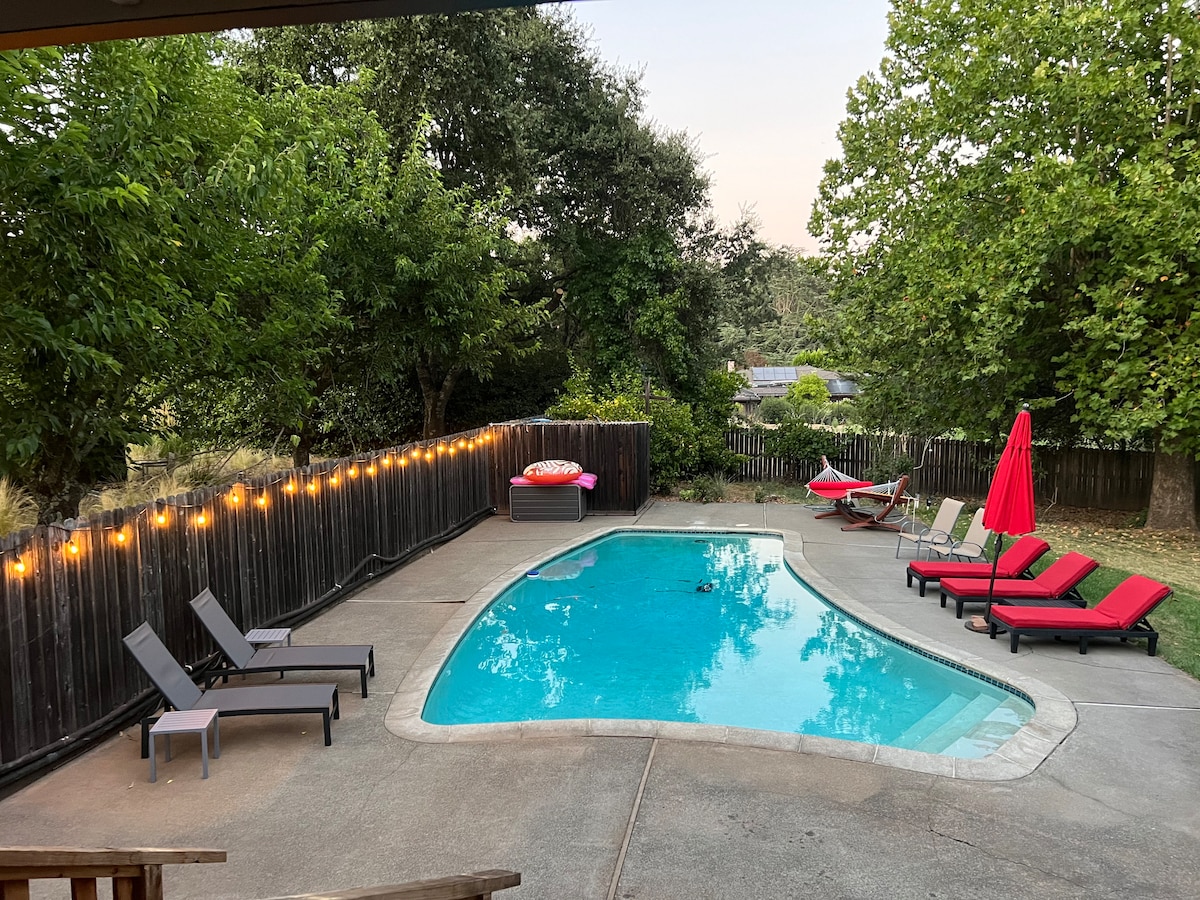 Enjoy indoor/outdoor living in Sonoma Valley with tons of amenities! Our home has a comfy, modern interior with 3 private bedrooms, office room with twin daybed, 2 full baths, large dining room, fully equipped kitchen and breakfast/bar table. The backyard has a large pool (seasonal), gas bbq, fire table, seating and dining table. Minutes by car to Sonoma Square, Glen Ellen, wineries, hiking trails, spas, shopping, & eateries. Walking distance to a park, cafe, mexican restaurant, and 7-11 store.