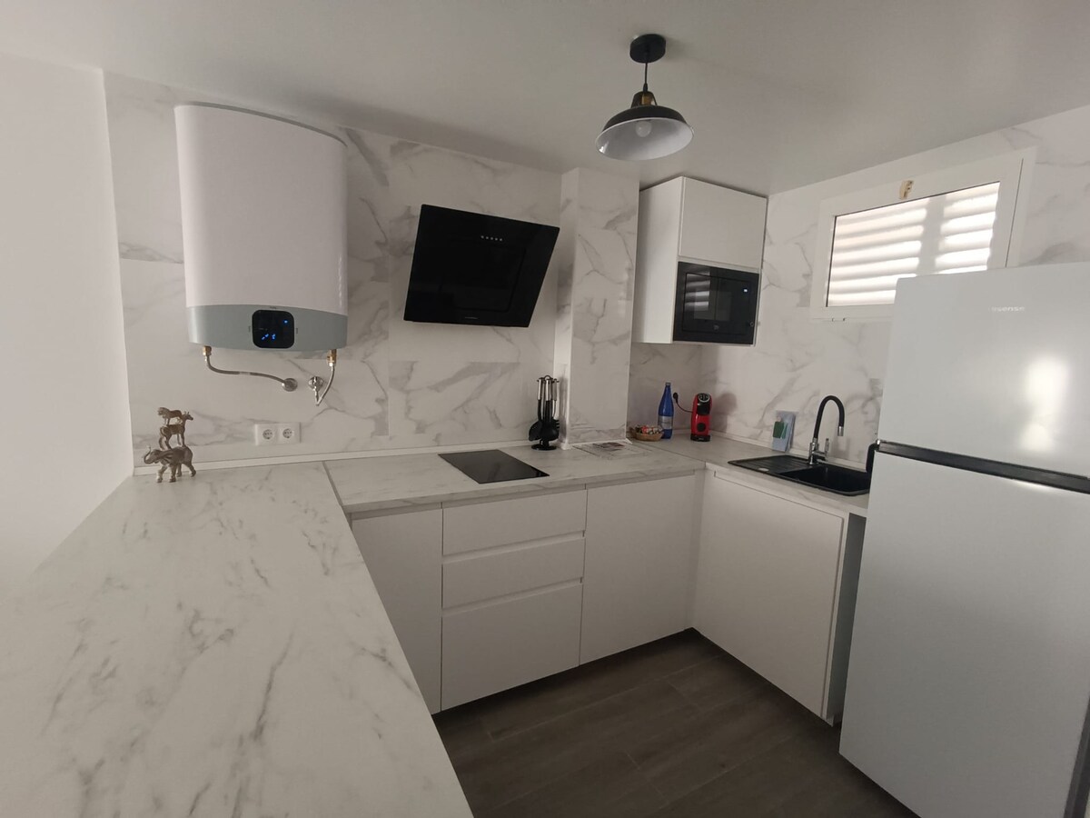 Apartamento a estrenar, totalmente reformado. Decoración con estilo, paredes de hormigón y pintura blanca lisa, armarios de hierro con cristales antiguos, mesas de maderas antiguas recicladas, sofas de lino, cocina de microcemento, con lavavajillas, horno, microondas, lavadora, secadora... Luz ambiente y cálida