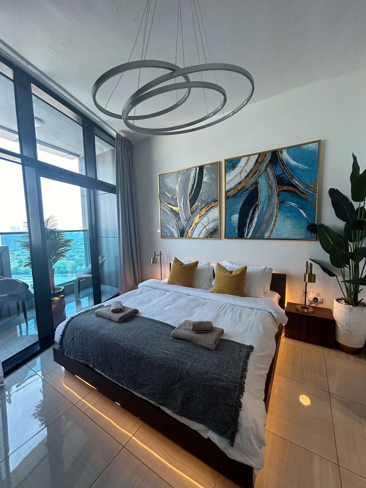 At our king bed suite you will first arrive to our modernly decorated lobby in this prime central location, that will lead you up to you luxurious holiday home, where you will be able to enjoy the stunning lake view and the skyline of the city of Dubai. And when you are finally ready to tuck in for the night you will sink in our deluxe king mattress with orthopedic qualities and covered with 400 thread count of 100% combed cotton sateen sheets that feels soft and comfortable against your skin.