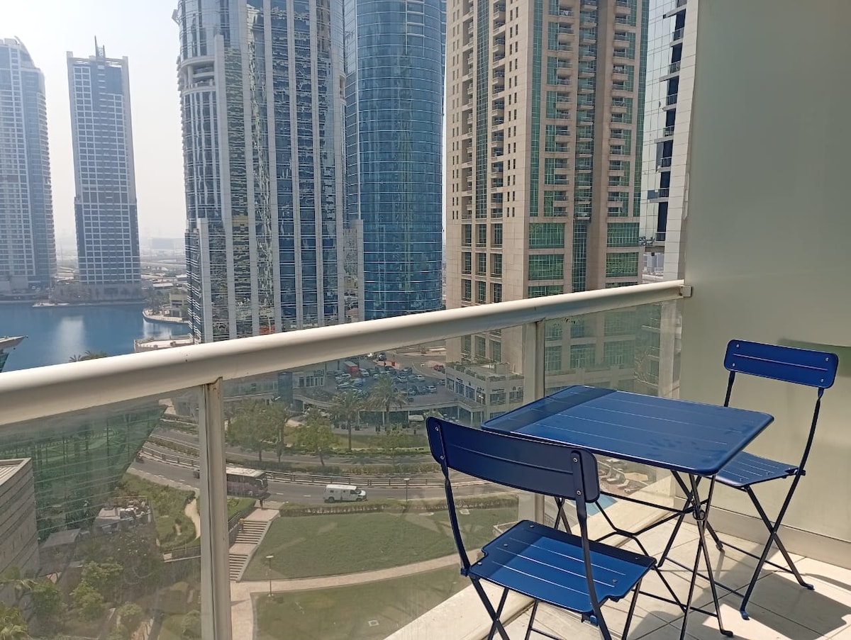 This 489 sq feet studio is located at Damac Lake Terrace, a luxury skyscraper in the affluent neighborhood of Jumeirah Lake Towers (JLT). The place is a 25 meter walk (2 min) to the DMCC Metro station. The JLT neighborhood is famous for its lakes, parks and range of restaurants (all types of cuisines and all types of price ranges). The famous JBR beach in Dubai Marina is 10 min by Metro/Tram, or a 20 min walk. Marina Mall is a 20 min walk, while Dubai Mall metro station is 20 min by Metro.