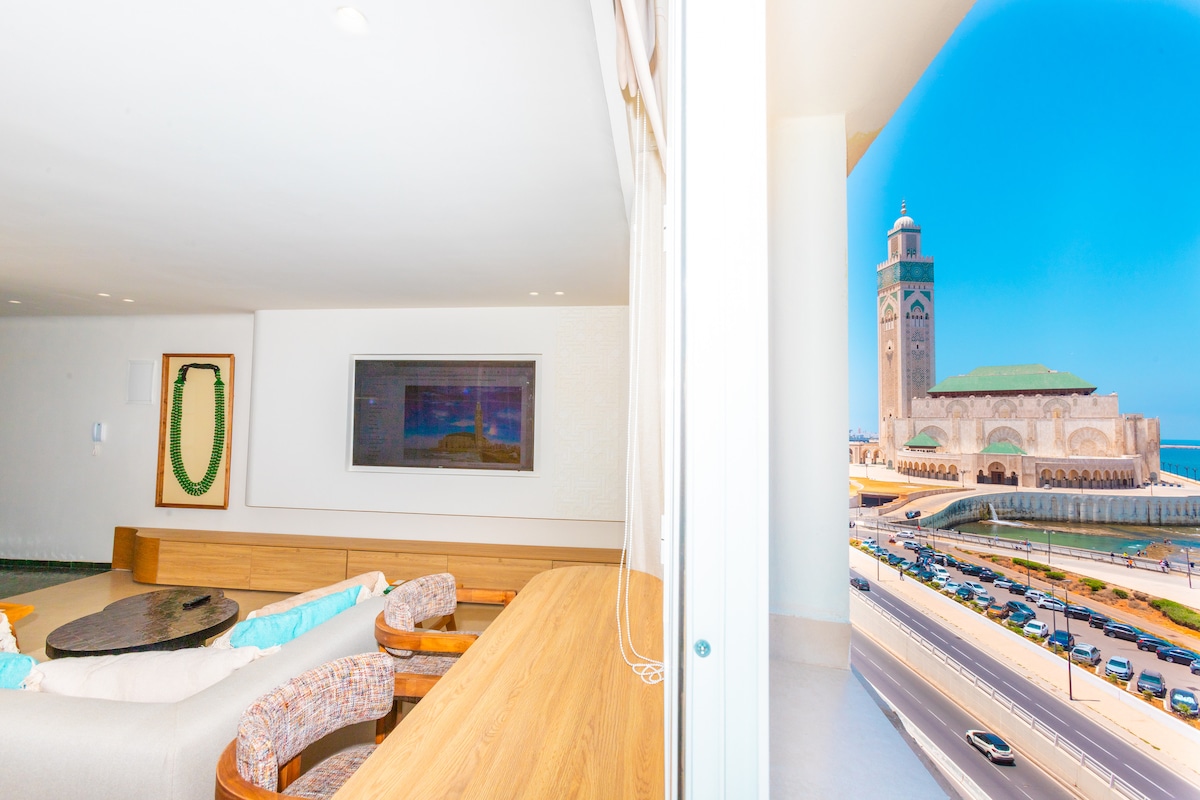 Front de mer 1ère Ligne, Vue unique sur Océan à 20m, Mosquée HassanII, et sur la Corniche. Lumineux, Étage élevé, Prestation de Luxe. Fibre, Wifi Haut Débit. Promenade Bord de Mer en bas de l appt ainsi que Resto, Café, Boulangerie, et toutes commodités. Restos, Bars branchés à moins de 5 minutes. Supermarché à 3 minutes, Gare Casa Voyageurs et Port à 5 minutes. Médina, Bazars à 5 Minutes. RicksCafé, Squala à 3 minutes. HyperCentre,Tram. Parking ss-sol gratuit. Navette aéroport payante possible