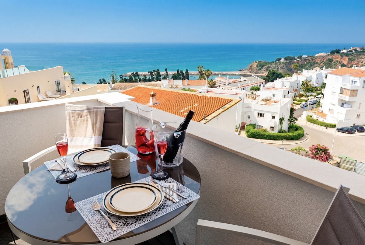 Amazing 180° Seafront view with private heatable swimming pool 2 bedrooms, 1 living room, 1 dining room, 1 fully equipped kitchen, 2 bathrooms, 2 terraces. Recently refurbished and fully equipped. Modern and stylish. Fantastic views over the ocean and Albufeira's beach/city. Private swimming pool with ocean view. Central location. Easy parking. All commodities within 100 meters. 4 minutes walk from the beach. The apartment is on the 3rd (and last) floor of a 3 storey typical Algarvian villa.