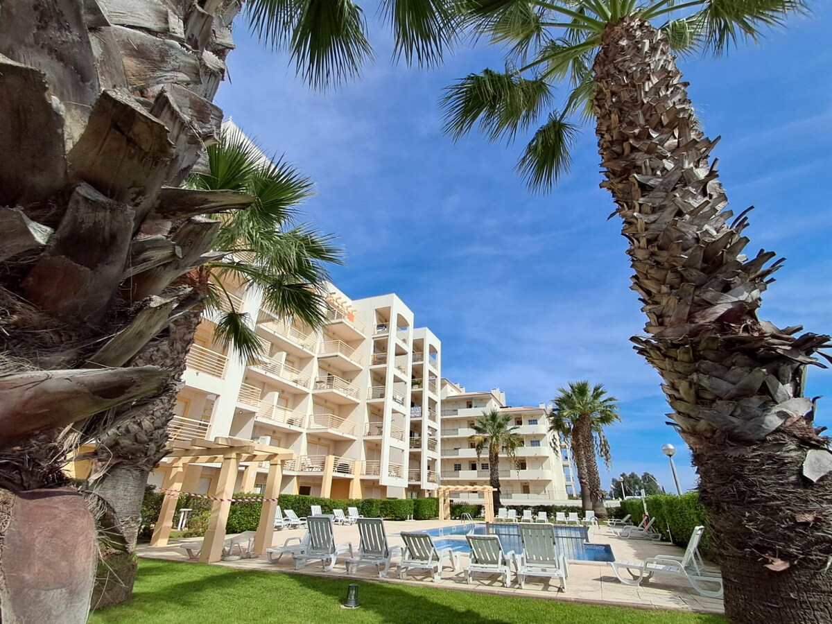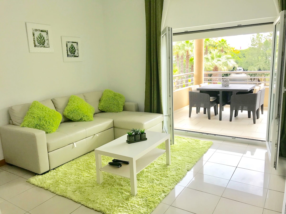 1 bedroom apartment in the Herdade dos Salgados 5 star resort, ideal for couples with up to 1 children looking for comfortable and relaxed holidays close to the nature, beach and golf. The apartment is on the second floor, has a large balcony (17 m2), a huge living room (44 m2), excellent view over the 7 swimming pools and it is in a resort with extensive green areas (750 palm trees and 2,500 olive trees). The resort has direct connections to Salgados Golf and to the beach.