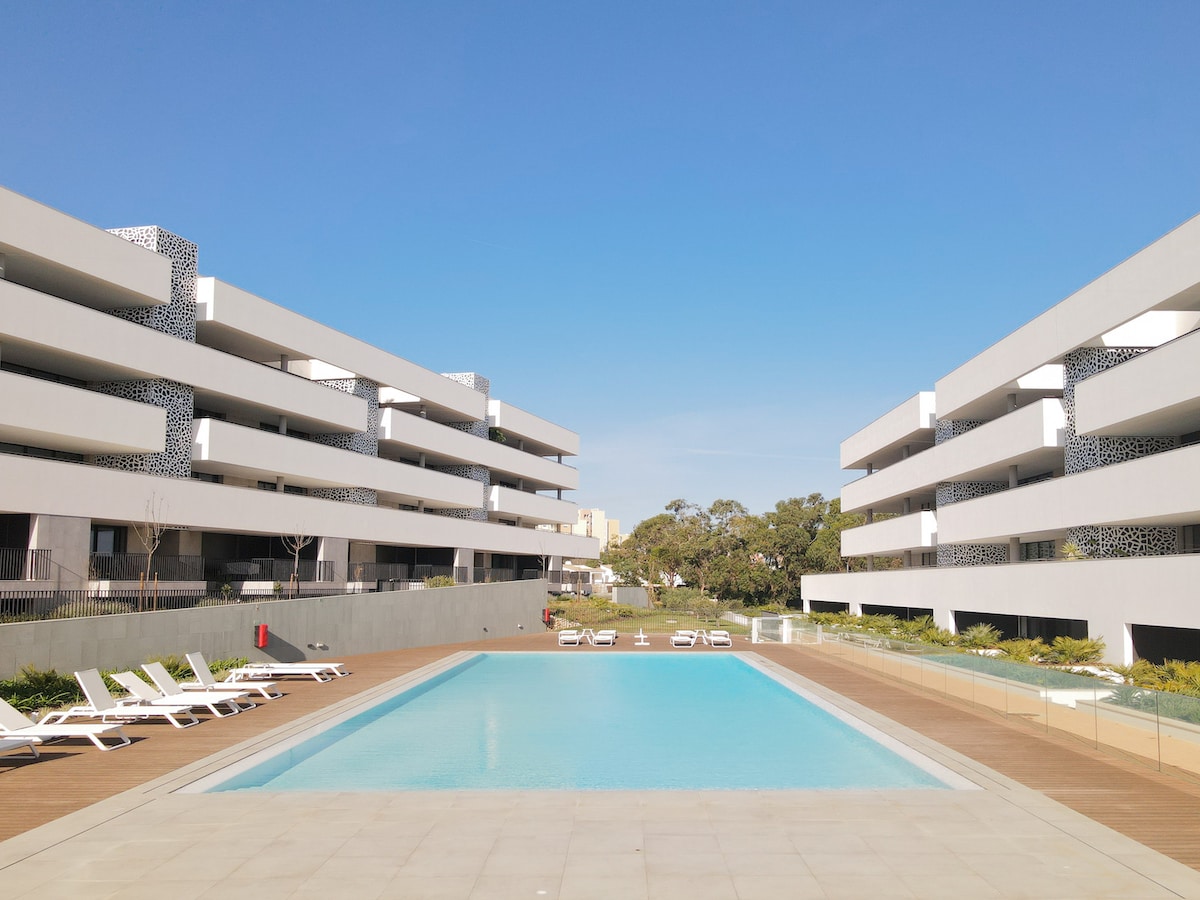 Welcome to Lagos Lounge! Full relaxation on a massive 59m² (636 sqft) outdoor patio, perfect for dining or lounging in Algarve’s sun. Enjoy a modern apartment with fully equipped chef's kitchen, cozy living area, two bedrooms, washer (and dryer), and more... Just a 10 minute walk to Lagos Old Town! Large pool, gym, and sauna. Be one of the first guests in this brand new building! A luxury getaway in the heart of the action.