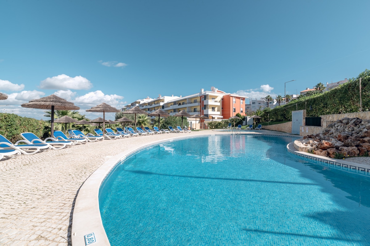 Our apartment is located at Iberlagos - a complex set atop the cliffs that frame Dona Ana Beach and 8 minutes walking from town center. The apartment is a two bedroom ground floor, with a lovely porch with partial sea view and direct access to the complex gardens. Our guests have full access to the complex swimming pool included in their stay. Loungers and shades in the pool area are rented out for a fee by the pool manager.