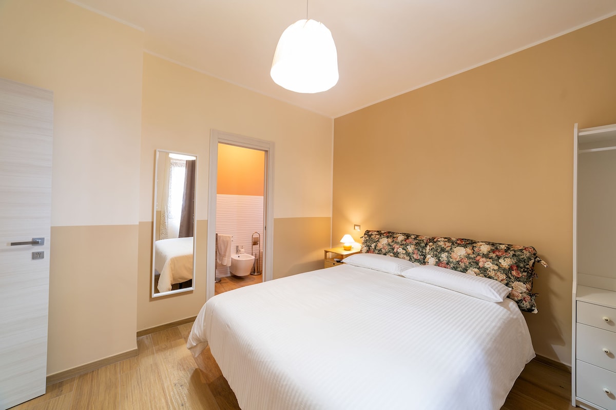 Confortevole ed elegante camera matrimoniale, in stabile moderno, arredata in maniera funzionale per viaggiatori da tutto il mondo. Il bagno offre una cabina doccia, sanitari completi e welcome kit con shampoo, balsamo, bagno doccia e asciugacapelli. La camera da letto, molto accogliente e luminosa, è arredata da una TV e da una piccola area lavoro composta da scrivania e sedia.