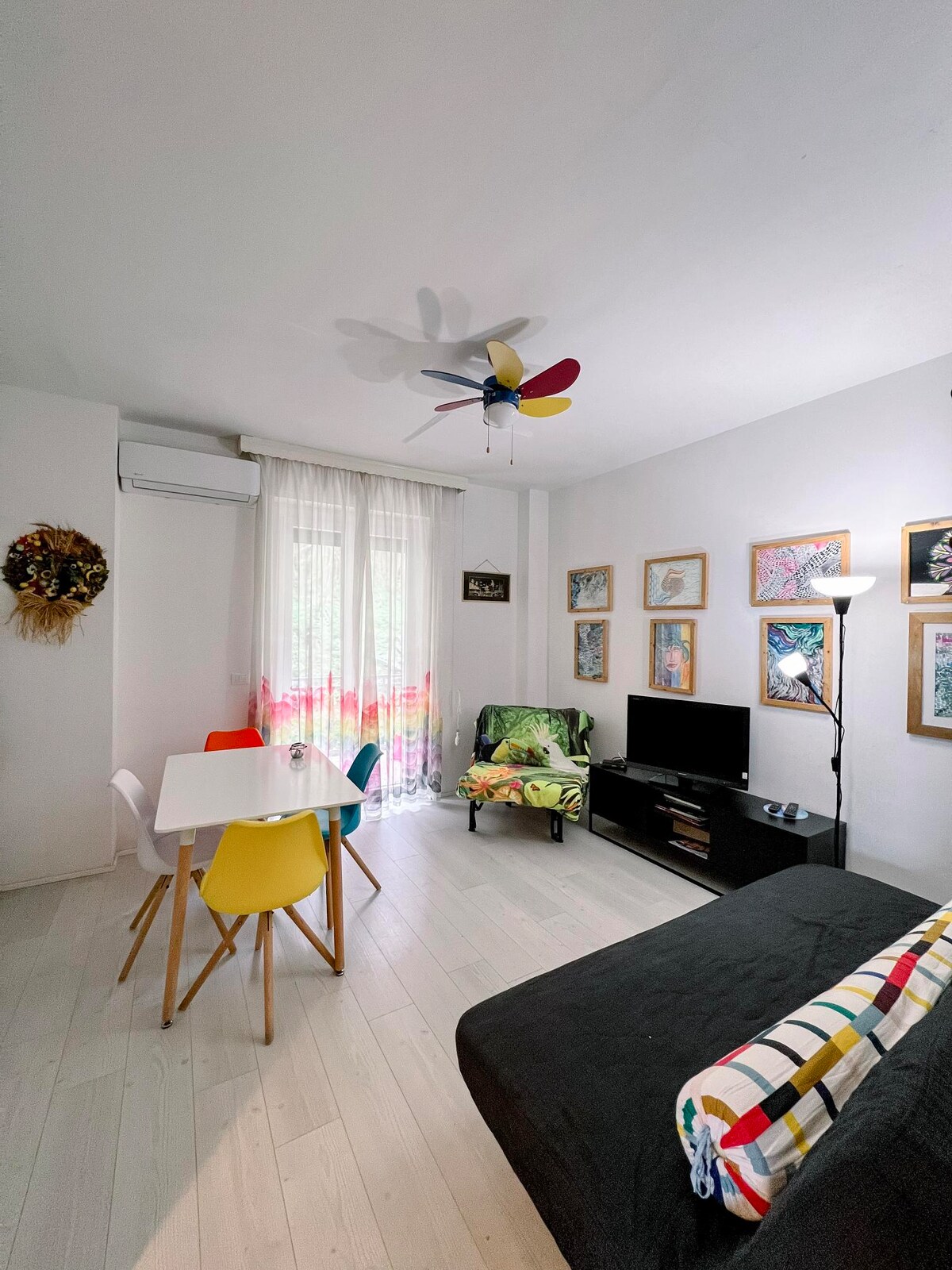 Brand new two-room apartment in a prestigious building with excellent finishes. The location is strategic, adjacent to the motorway junction, convenient for the airport (about 20 minutes by bus), it is 250 m from the center and 1000m from the sea where there are beach establishments. The apartment is finely furnished with kitchen and all comforts. There is a double bedroom and there is also the possibility of two more beds in the living room on a comfortable sofa. Exclusive fenced parking space.