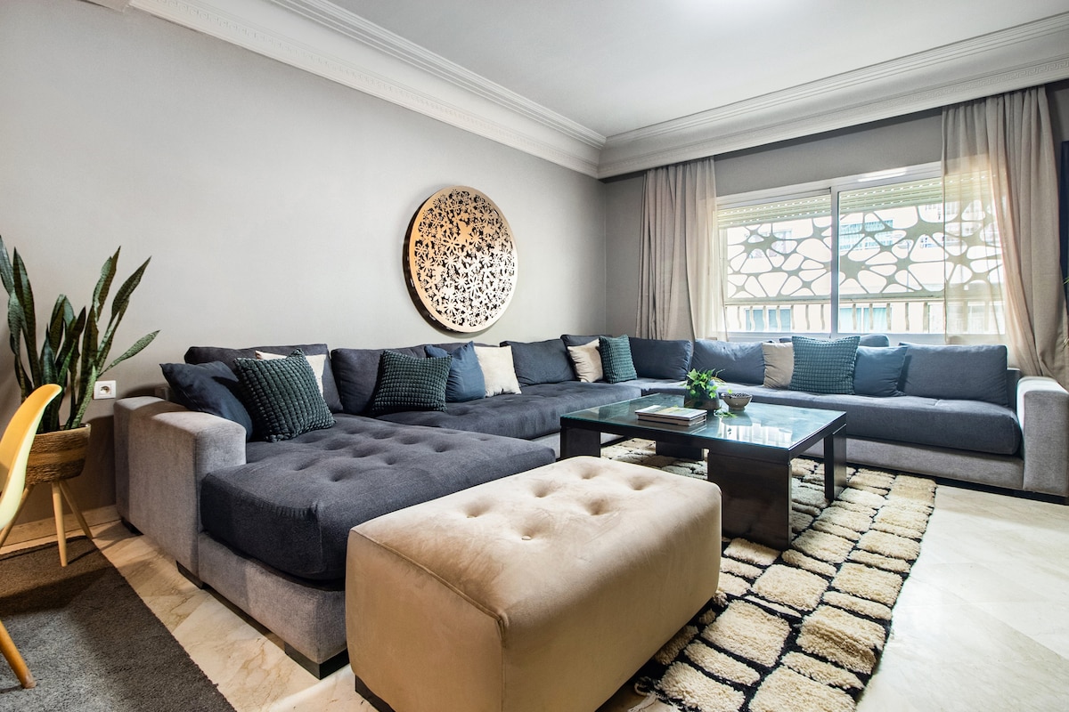 ⚠️Fêtes et musique forte totalement interdites. Merci de respecter la tranquillité des lieux.⚠️ Appartement moderne de 120m² avec vue sur mer, idéalement situé à proximité immédiate de la Mosquée Hassan II et la Corniche de Casablanca. Spacieux et décoré avec goût, il offre 2 chambres confortables, un balcon avec vue sur l’océan, ainsi qu’un accès facile aux cafés, restaurants et commerces à proximité. Place de parking privée. Une pièce d’identité valide est requise au check-in.