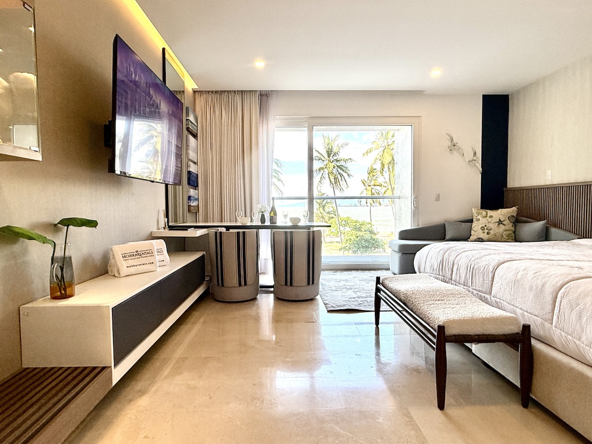 ✨ Stay with Moikkarentals at this 1st-floor beachfront luxury studio (Harbor171 Puerto Vallarta). Relax on your private terrace, enjoy modern furnishings, and stay connected with fast fiber optic internet. Guests have full access to 8 pools, 2 jacuzzis, and the rooftop infinity pool & gym on the 28th floor – the highest in PV. Steps from the Versalles foodie district and just minutes to Downtown & the Romantic Zone.