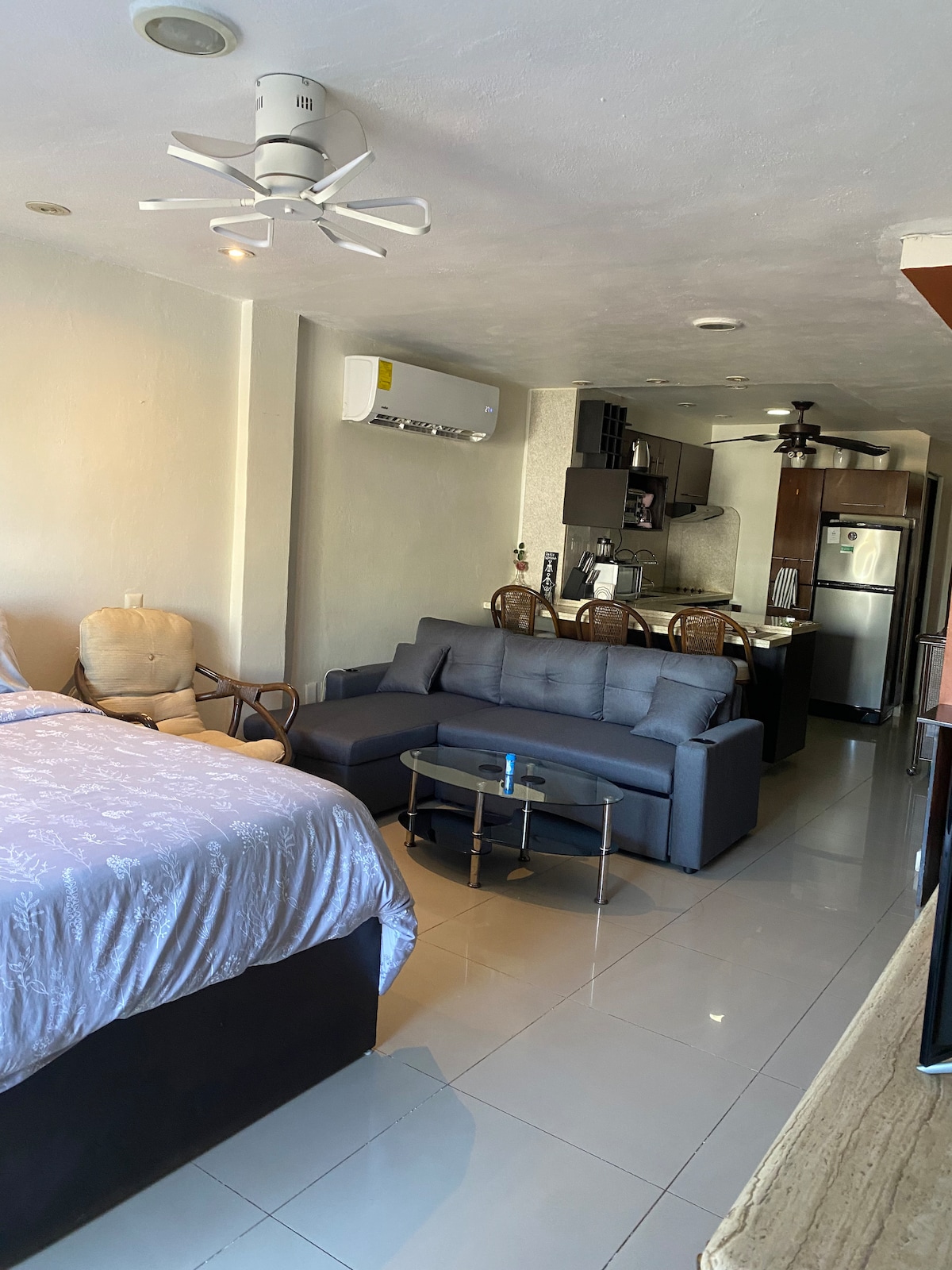 Cozy 323 ft² studio with terrace and city view. Access to the building’s rooftop with jacuzzi, open to guests with and jungle views. Style, comfort, and functional design just 5 minutes from the Marina of PV. 24/7 security. Queen murphy bed that transforms into a comfortable sofa, high-speed Wi-Fi, art TV, fully equipped kitchen, bathroom with massage shower, and washer-dryer. Photos in the listing show how the space adapts to every moment of the day.
