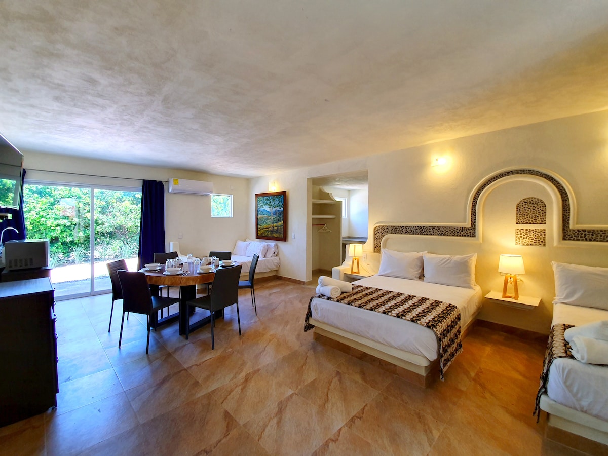 Experience life in the jungle and sleep peacefully surrounded by lush landscaping. Sit out on the oversized patio with bathtub, chairs, a hammock, and space for morning meditation. Our Wild Studio with garden view combines a modern yet jungle chic feeling highlighted by Mexican color accents and decorative style, this large comfortable studio comes with a/c , Macbook Air, designer sofa, exterior bathroom and shower.