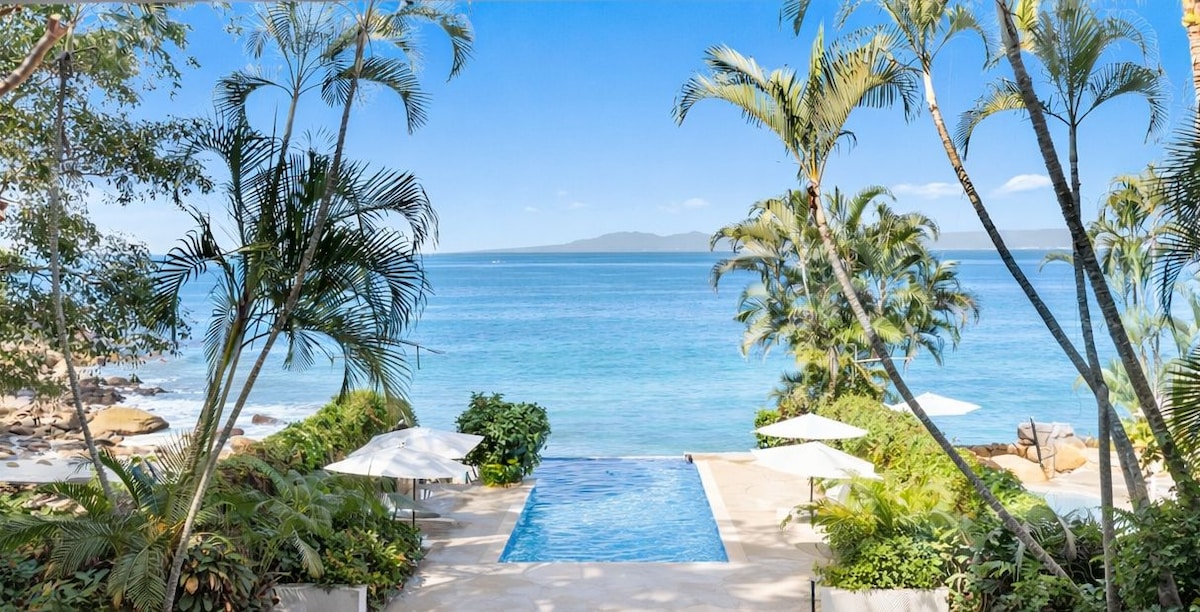Look out to the Bahía de Banderas and the famous Los Arcos National Marine Park from this 3,000-square-foot condo with a dramatic, furnished wrap-around waterfront terrace in a gated, family-friendly community. Guests will enjoy exclusive privileges at the private beach club, wine bar, two pools, direct beach access, a cafe, gyms, a jacuzzi, a sauna, paddle boards, and kayaks. Twice a week cleaning, on-site concierge service, parking, and 24-hour security with controlled entry included.