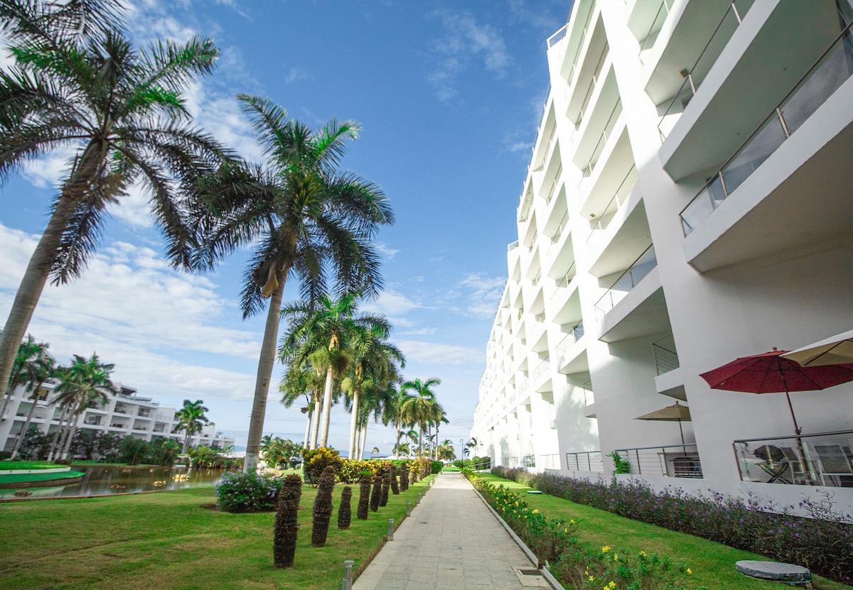 Discover the pleasure of a perfect vacation with your family and friends in our charming first-floor apartment, specially designed for those traveling with seniors or children. Located in the exclusive Nuevo Vallarta area. 24/7 security, ensuring peace of mind. Surrounded by top-notch restaurants, golf courses, supermarkets, and just a 10-min walk to the beach, relax on the terrace with a cup of coffee or a glass of wine enjoying beautiful gardens. Live a unique and secure experience with us!☀️