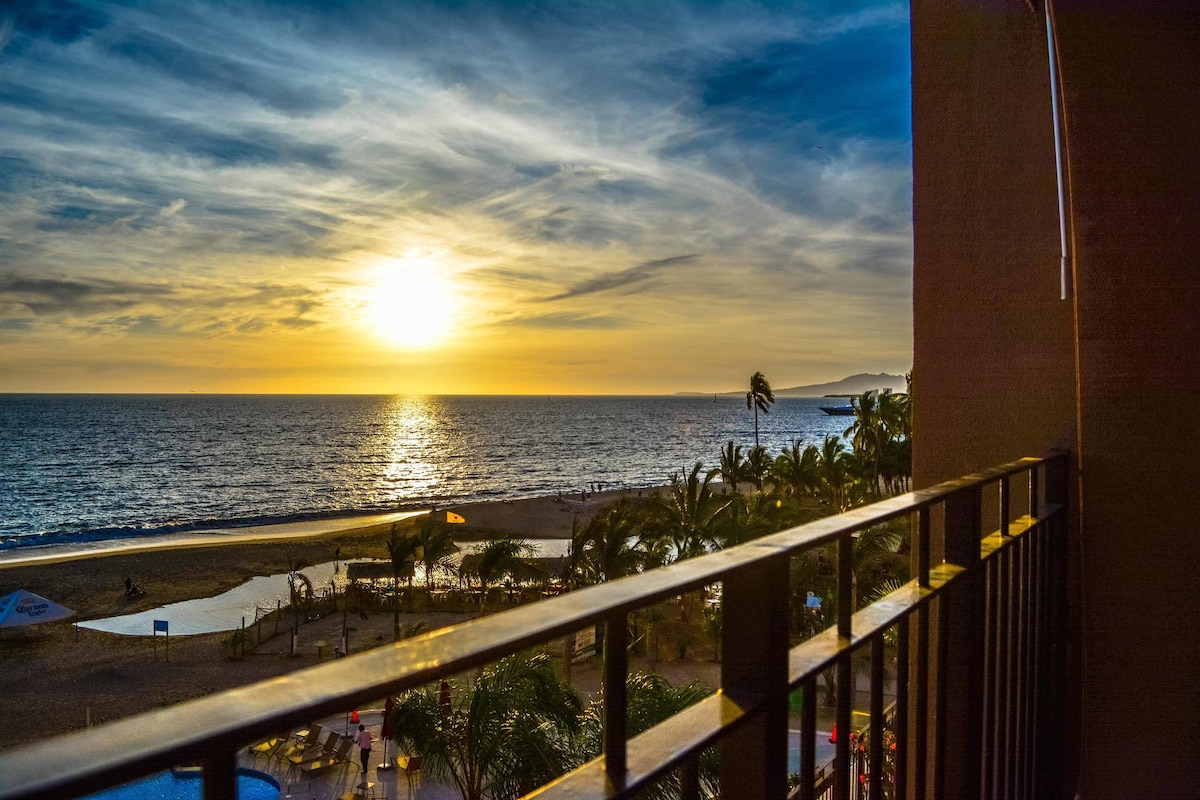 Condominium on the 12th floor. Expansive view of the ocean and river walk. Gorgeous amenities include 5 pools including, 5 hot tubs, tennis courts, gym, spa, onsite restaurant and room service. 24/7 security & safe. Spacious balcony from living room and bedroom overlooks the ocean. Includes covered parking, electricity, air conditioning, hi speed wifi, 2 large smart TV's, housekeeping every 2 weeks. Close for walking to grocery, restaurants, clubs, trail. Courtesy pick up from airport.