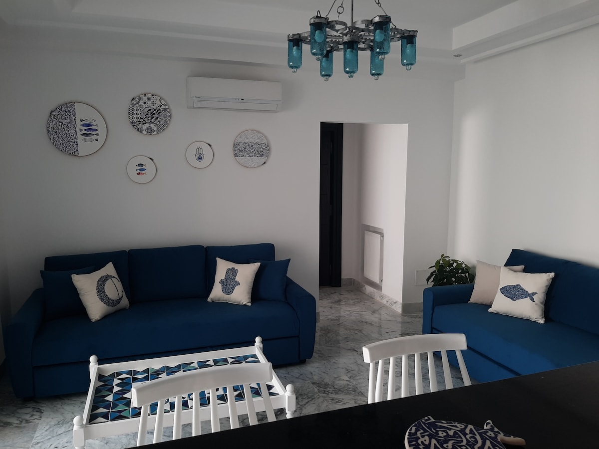 Cozy and well equipped apartment in a touristic neighborhood close to several beach bars, restaurants, cafés, bars, Supermarkets, the theatre… You’ll need a 10 minutes walk to reach one of the best beach spots in Hammamet. Smart TV, Wifi, Netflix account and international TV channels are provided. Ideal for couples and families, our purpose is to make you feel at your vacation home. We care about making your stay pleasant and will be available to guide, help and advise during your stay.