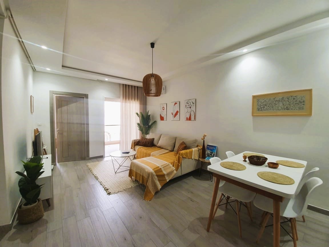 Bienvenue dans cet appartement lumineux situé au cœur de Hammamet, dans une résidence moderne, calme et sécurisée, à seulement 2 minutes à pied de la plage. Profitez d’une vue panoramique exceptionnelle depuis la terrasse, idéale pour se détendre au soleil ou prendre un petit-déjeuner face au ciel bleu. L’appartement est entièrement équipé, décoré avec goût et pensé pour offrir un séjour confortable, agréable et reposant.
