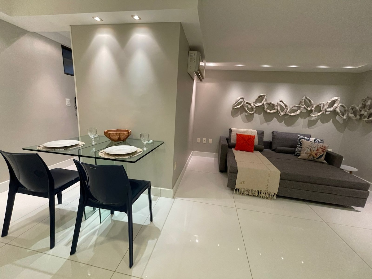 Flat/apartamento de alto padrão, bem decorado, aconchegante, limpo e arejado. * Cozinha: Micro-ondas, sanduicheira, liquidificador, cooktop a gás, geladeira, cafeteira (cápsulas Nespresso) e demais utensílios; * Sala/Quarto TV 50 polegadas, WIFI de alta velocidade, sofá-cama, mesa de jantar, cama de casal, guarda-roupa; * Banheiro: Box, chuveiro elétrico, espelho, ducha higiênica; Vagas de garagem subterrâneas rotativas Muito bem localizado a 350m da praia de Tambaú. *Não pode fumar.