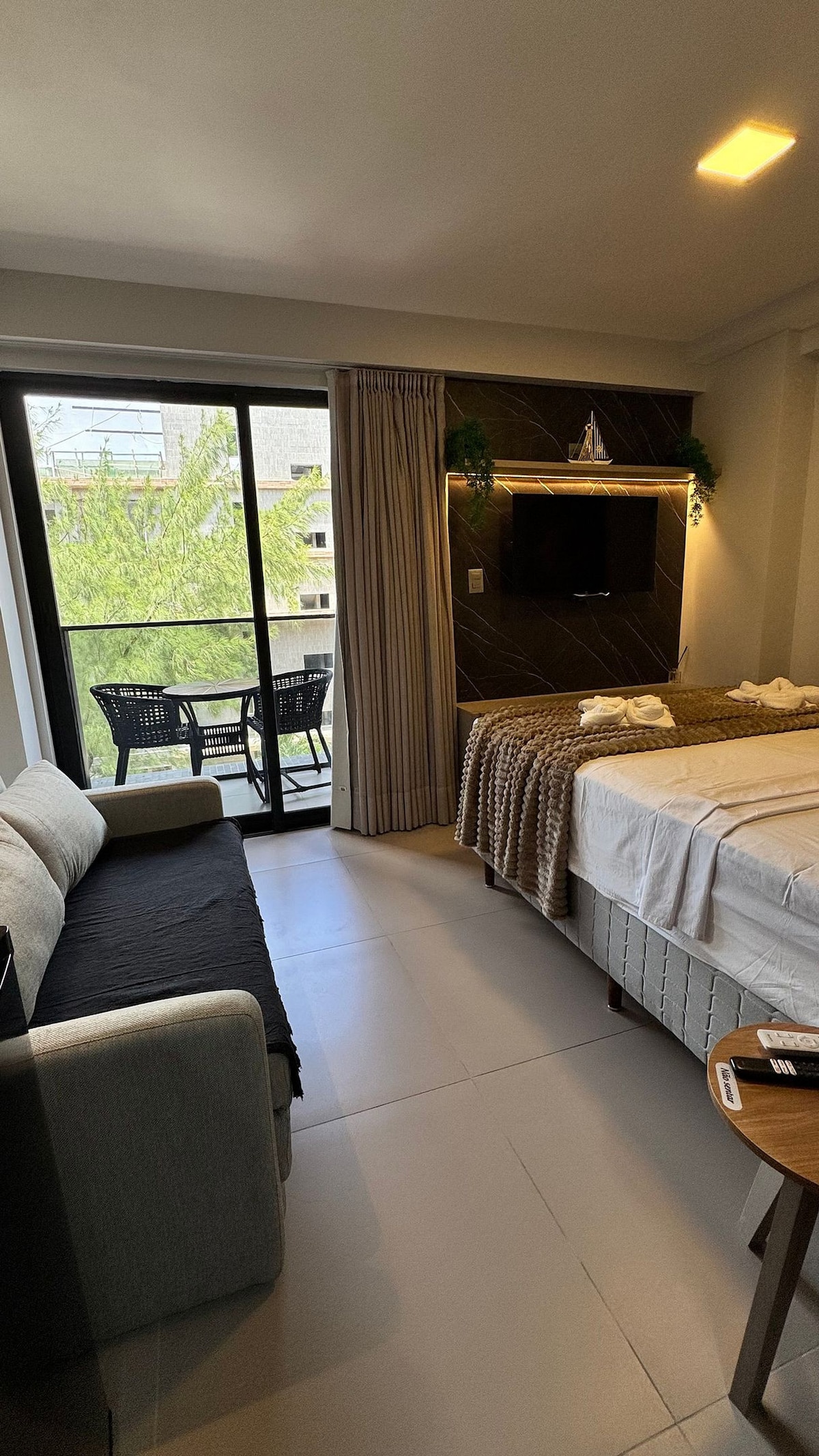 Studio diferenciado com 31 m², acima do padrão do condomínio, totalmente projetado com iluminação planejada e espaços bem aproveitados. Possui varanda com vista definitiva para o mar, a poucos metros da praia de Cabo Branco. Acomoda até 4 hóspedes, com cama Queen e sofá-cama, além de ar-condicionado e Wi-Fi. Condomínio estilo resort com piscina, recepção 24h, café da manhã opcional e garagem rotativa, em excelente localização.